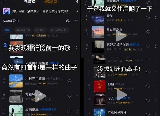 但问题在于,算法对洗歌作品尤其宽容,甚至无意中提供了鼓励。旋律熟悉、歌词直白、情绪浓烈的作品,更容易触发用户的快速点击和反复收听。哪怕用户只是抱着“听听是不是抄的”的好奇心点开一次,也会被算法算作有效播放。于是,榜单成为旋律复制工厂最醒目的宣传位,而热度也因此被进一步放大。