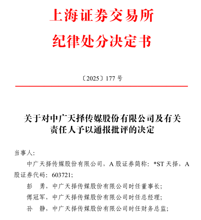 根据上交所在2025年9月15日发布的公告,上海证券交易所对*ST天择(603721)及其相关责任人予以通报批评。被处罚的责任人包括时任董事长彭勇、时任总经理傅冠军、时任财务总监孙静及时任董事会秘书周智。