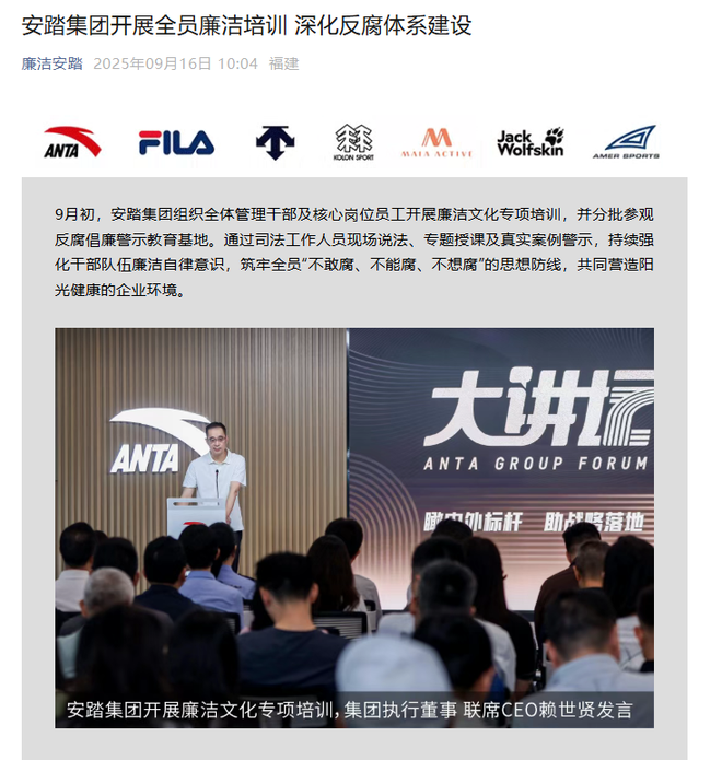 9月16日,廉洁安踏公众号发布消息称,2025年安踏推进反腐治理,截至8月,74人因严重舞弊触犯集团红线被辞退;涉嫌违法犯罪移交司法机关处理的内外部人员46人(内部21人,外部25人),其中包含总裁级1人,总监级14人、经理级4人;追诉离职人员3人(因在职期间职务犯罪);违反诚信廉洁责任条款的舞弊供应商及合作伙伴45家,查处案件涉及违法犯罪金额约3千万元。