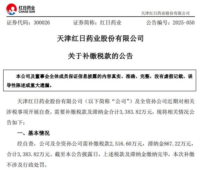 红日药业表示,截至公告披露日,上述税款及滞纳金缴纳完毕,本次补缴不涉及行政处罚。