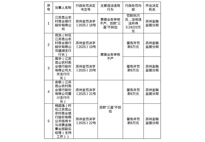此外,倪浩(时任江苏昆山农村商业银行股份有限公司建湖支行行长)、高华(江苏昆山农村商业银行股份有限公司大市支行行长)因票据业务审核不严,分别被警告并处罚款6万元;俞丽(江苏昆山农村商业银行股份有限公司震川支行行长)、杨超逸(时任江苏昆山农村商业银行股份有限公司信用卡与消费金融事业部副总经理(主持工作))因贷款"三查"不到位,分别被警告并处罚款6万元。![]()
