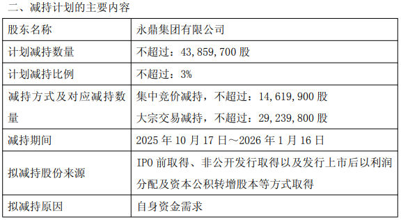 9月17日晚间,永鼎股份发布公告称,截至本公告披露日,公司控股股东永鼎集团有限公司(简称“永鼎集团”)持有公司无限售条件流通股382,618,695股,占公司总股本的26.171%。永鼎集团因自身资金需求,计划自本公告披露之日起15个交易日后的3个月内,拟通过集中竞价、大宗交易方式合计减持公司股份不超过43,859,700股,即不超过公司总股本的3%。