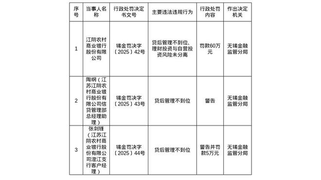 罚单显示,江阴农村商业银行股份有限公司的主要违法违规事实(案由)为:贷后管理不到位、理财投资与自营投资风险未分离。