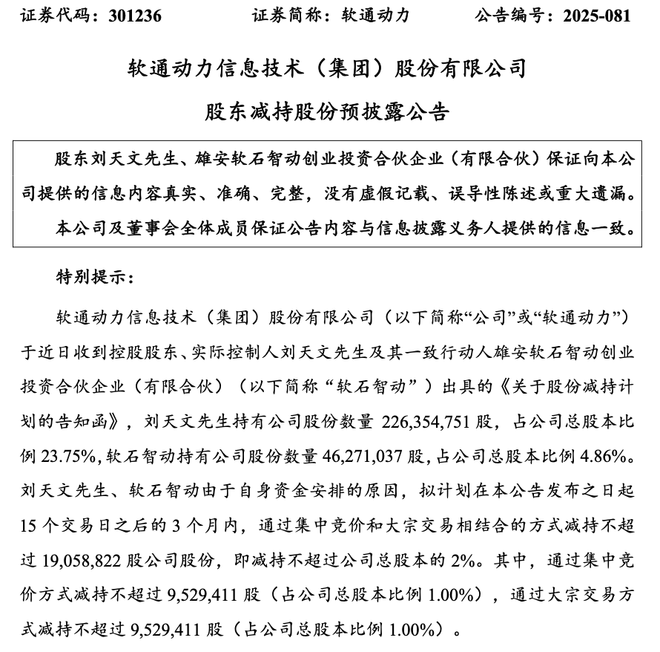 公告显示,刘天文持有公司股份数量226,354,751股,占公司总股本比例23.75%,软石智动持有公司股份数量46,271,037股,占公司总股本比例4.86%。